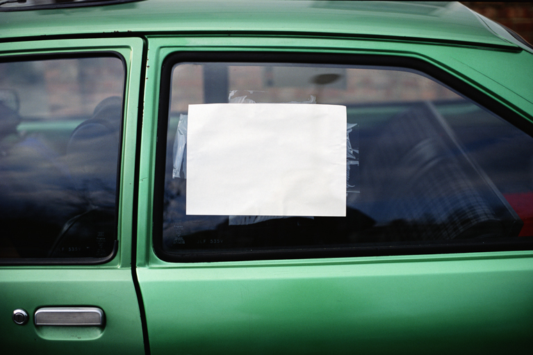 For all its informality and contingency, No 19 is formally quite succinct. The white rectangle is framed and isolated by the largely dark interior of the car; there is a bit of depth in the space behind the glass; the chipped metallic green of the car body frames the event in an abstract kind of way. It is a simple picture of three surfaces, all of which require and sustain each other, and there is nothing else. The metal supports the glass that supports the paper. The paper behind the glass calls attention to the metal that it advertises, or fails to advertise: the intended relationship – the purposeful but entirely un-aesthetic placement of materials in relationship to one another – has come undone, has slowly dissolved, along with the ink that is no longer there. In doing so, it has become something else. A malfunction has become a monochrome.